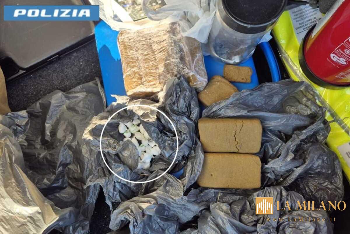 I sospettati sono stati immediatamente fermati per un controllo più approfondito. Con l’ausilio di un’unità cinofila della Guardia di Finanza, gli agenti hanno rinvenuto 2,050 kg di hashish, suddivisi in panetti da circa 100 grammi ciascuno, e 102 grammi di cocaina contenuti in 110 involucri termosaldati da 1 grammo, pronti per la vendita al dettaglio.